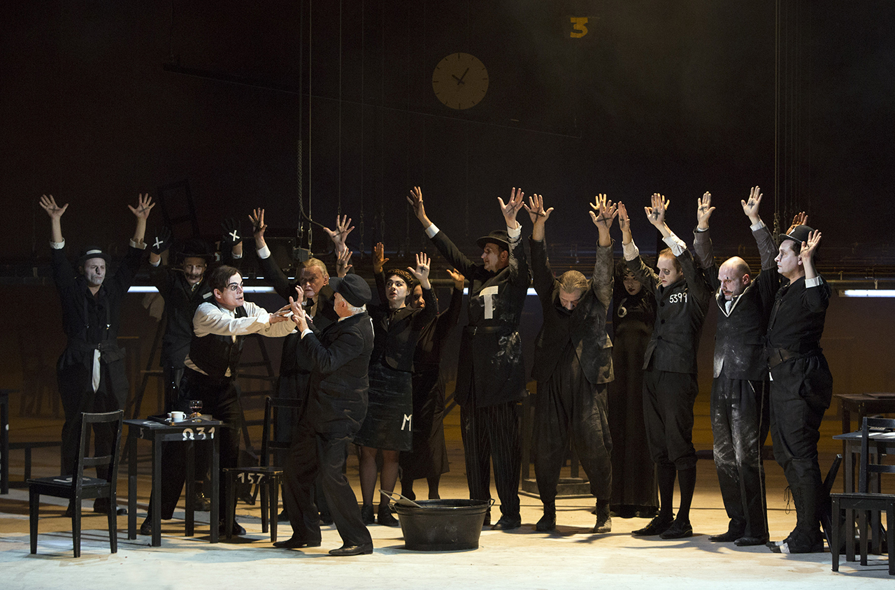 Escena de Kafkas Prozess. Berliner Ensemble, 2014. Con: Veit Schubert, Martin Schwab; Jörg Thieme, Andy Klinger, Roman Kaminski, Marina Senckel, Swetlana Schönfeld, Norbert Stöß, Joachim Nimtz, Laura Tratnik, Raphael Dwinger, Jakob Schneider y Boris Jacoby - Fotografía de Lucie Jansch |