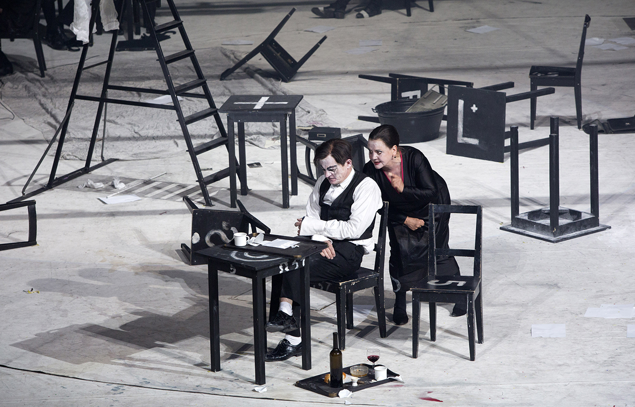 Escena de Kafkas Prozess. Berliner Ensemble, 2014. Con: Veit Schubert y Swetlana Schönfeld - Fotografía de Lucie Jansch |